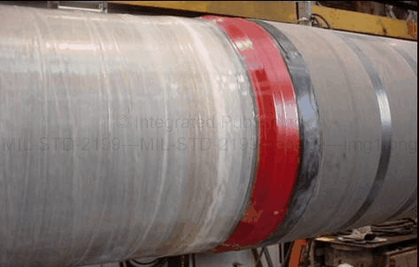 k. Upon completion of the four-ply wrap, one or two circumferential turns shall be applied at each end to fair the GRP to the sleeve. A completed GRP application is shown on figure A-14.